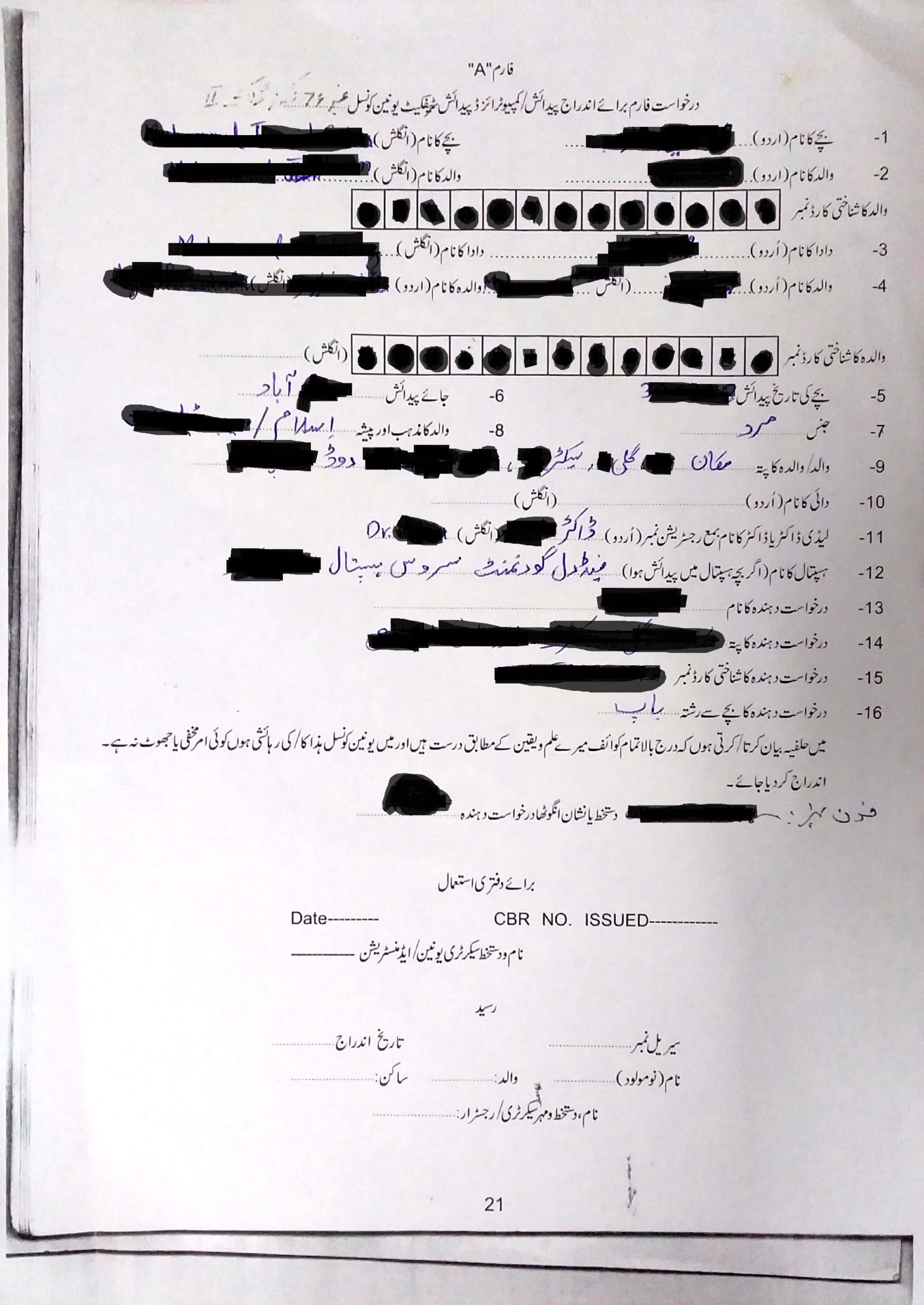 This sample form of childbirth registration is available at each union councils office. Read it carefully and then fill all blanks. Start with mention the name of the parents of the child, his/her birth date. Then mention the name of grandfather. Attach a copy of the parent’s CNIC.